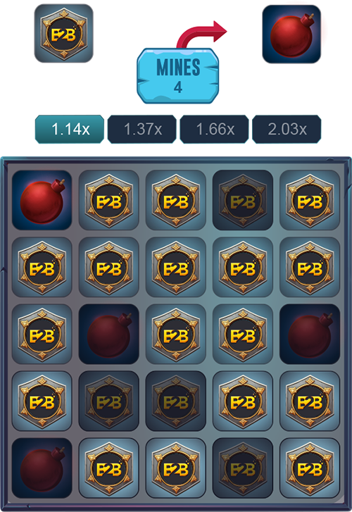 Mines game contains 25 covered fields, under each field may or may not contain bomb. The player will uncover the fields. It is possible to have as low as 1 bomb, as many as 24 bombs on the game panel.