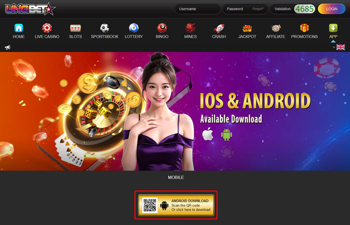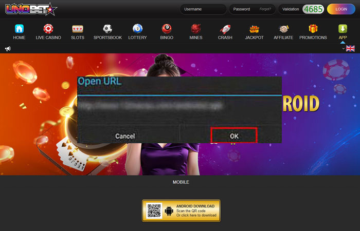 - Untuk men-download aplikasinya , cukup klik tombol Download , atau kunjungi https://android-uno.alt-api.com/LiveCasino.apk dengan perangkat ponsel Anda , atau scan QR code . pemain yang ada bisa login dengan detail akun yang ada